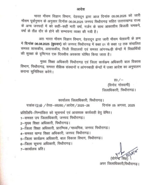 पिथौरागढ़, रेड अलर्ट के चलते 6 अगस्त को भी जनपद के समस्त विद्यालय एवं आंगनबाड़ी केंद्र रहेंगे बंद*