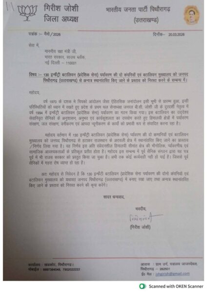 गिरीश जोशी ने राजनाथ सिंह से मुलाकात कर 130 पर्यावरण बतालियन को पिथौरागढ़ से कहीं और भेजने के प्रस्ताव का विरोध किया। उन्होंने इसे रोकने की मांग की।