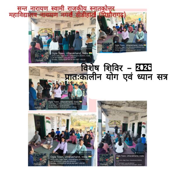 पिथौरागढ़ – संत नारायण स्वामी राजकीय स्नातकोत्तर महाविद्यालय नारायण नगर के *राष्ट्रीय सेवा योजना (NSS)* के अंतर्गत ग्राम पंचायत ओगला, डीडीहाट (पिथौरागढ़) में आयोजित सात दिवसीय विशेष शिविर का *द्वितीय दिवस (22-02-2026)* उत्साह और सेवा भावना के साथ संपन्न हुआ।